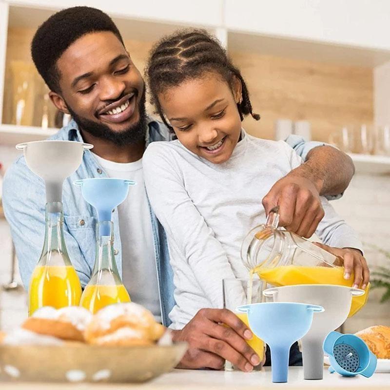 The Kitchen Funnel set of 4, which has 1 filter and 3 different sized funnels. It will help you prevent spillage effectively, say goodbye to waste and counter mess when infusing oils, home-brewing, spirits, flour, salt and etc, provide you a neat kitchen counter.