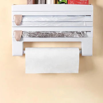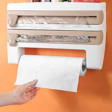 Wall-mounted kitchen roll holder with cling film, storage rack, and foil cutter. Convenient and suitable for using to storage cling film in the kitchen